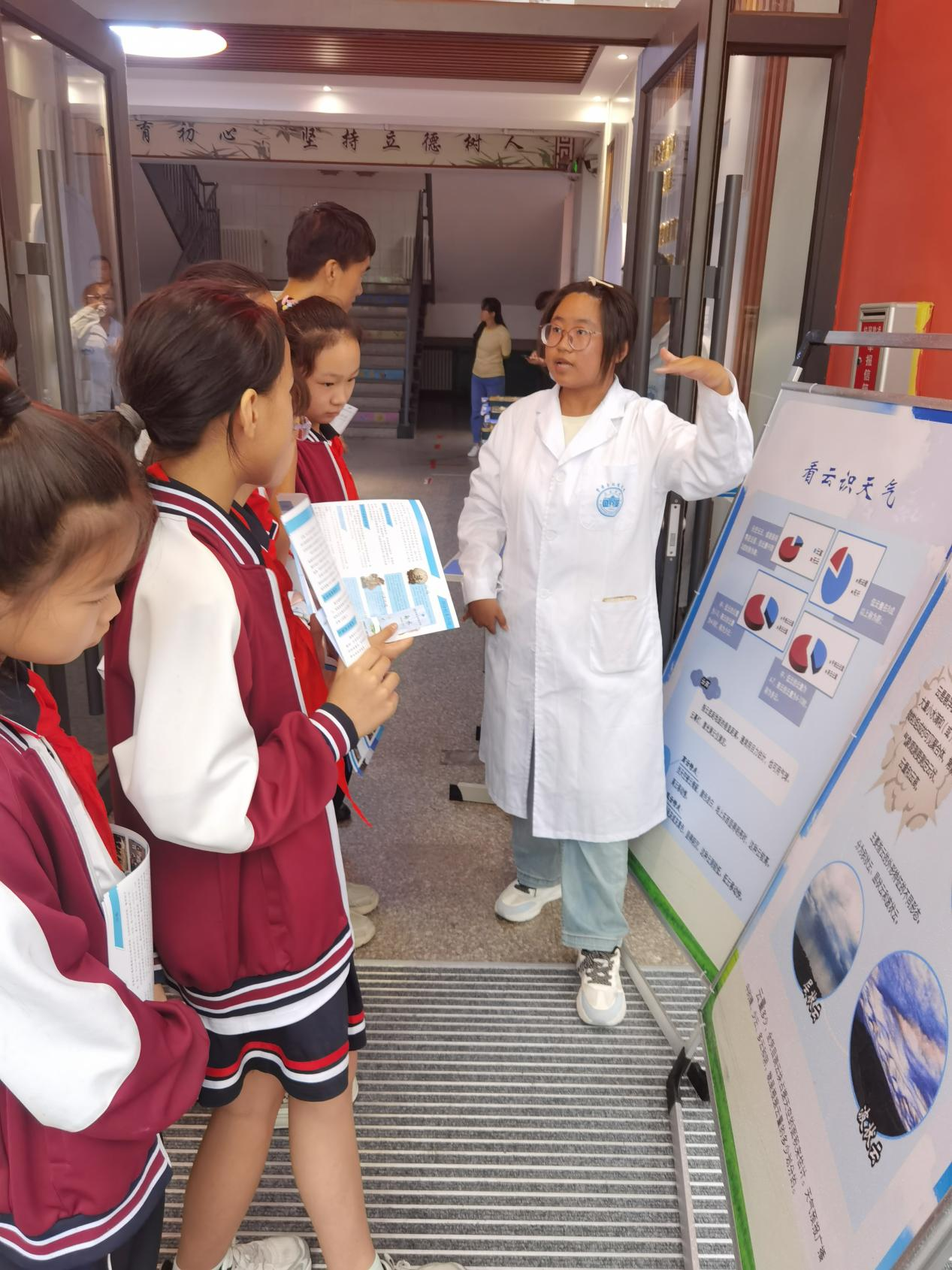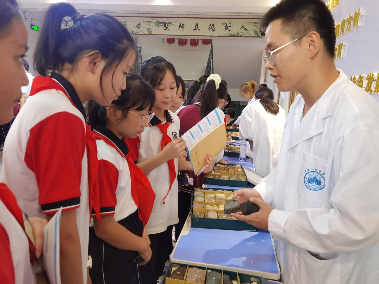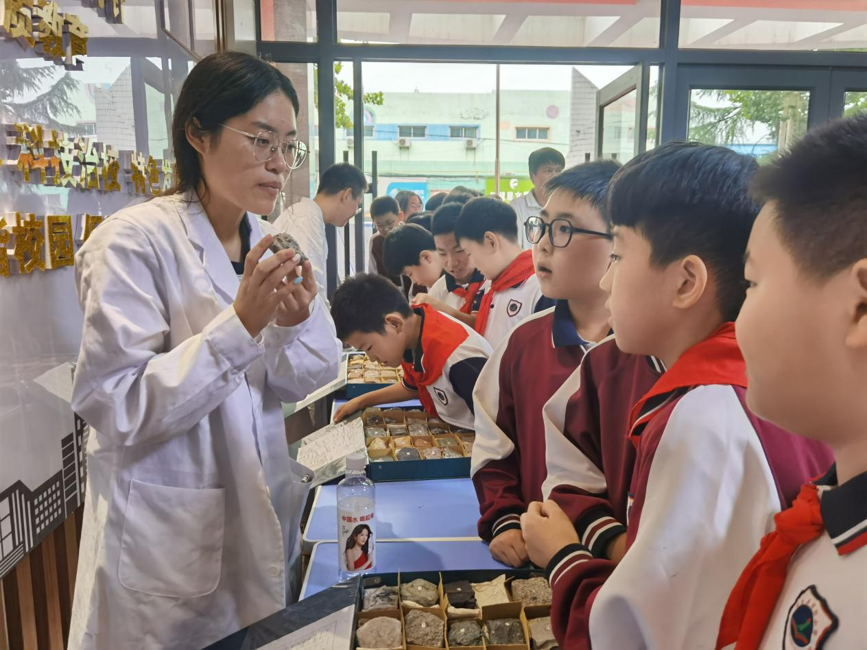 签约仪式后,现场开展矿物、岩石标本和科普知识展览活动,王可新博士和大学生科普志愿者向学生们现场讲解岩石、矿物、气象等地理知识,解答学生提问,现场氛围活跃。